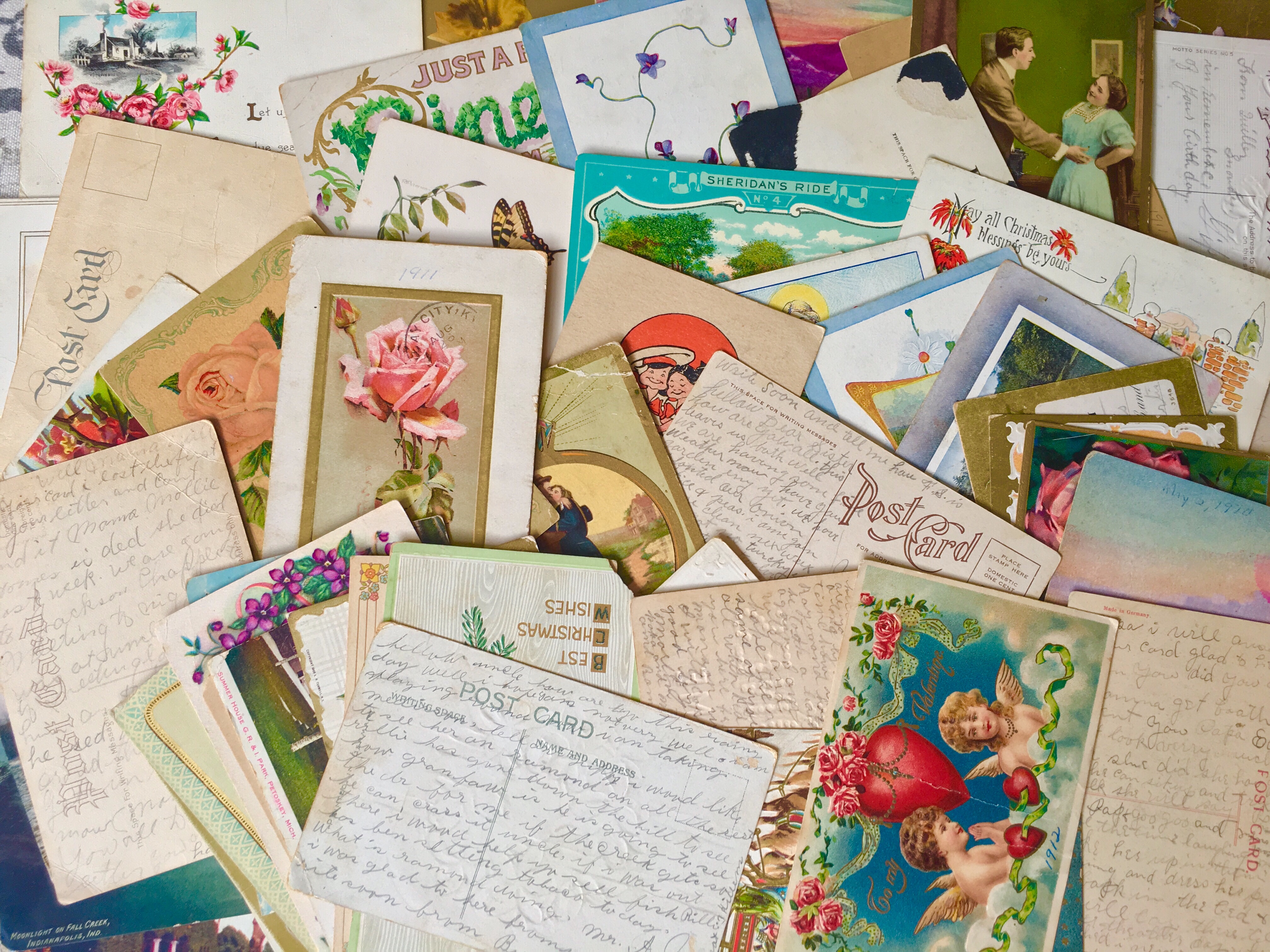 Recently, my Grandma gave me an envelope full of postcards from the early 1900’s.  Most of them are from her side of the family. The photo above is a spread of them. The penmanship, images, and every crease or rip are just so exciting to me. I love moments from the past and a postcard is a beautiful piece of mail from a person saying, “Hey, I’m somewhere on this planet — thinking of YOU.” Kind of a lost art. But, I have to say, these are a stunning argument to bring it back.